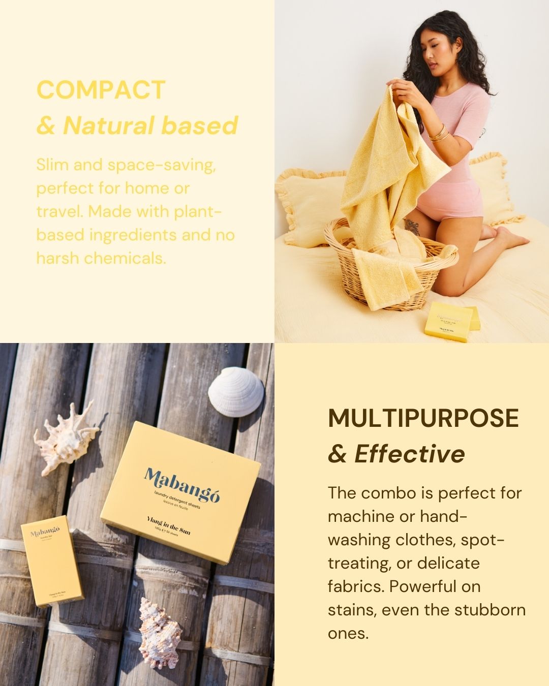 Our laundry sheets and soap bar are both infused with our signature scent, Ylang in the Sun. Think tropical blooms of Ylang-Ylang, kissed with warm, sunlit notes — a fragrance that feels like fresh laundry drying in the island breeze. It leaves your clothes with a subtle, uplifting scent that’s never overpowering, just beautifully fresh and flowery.